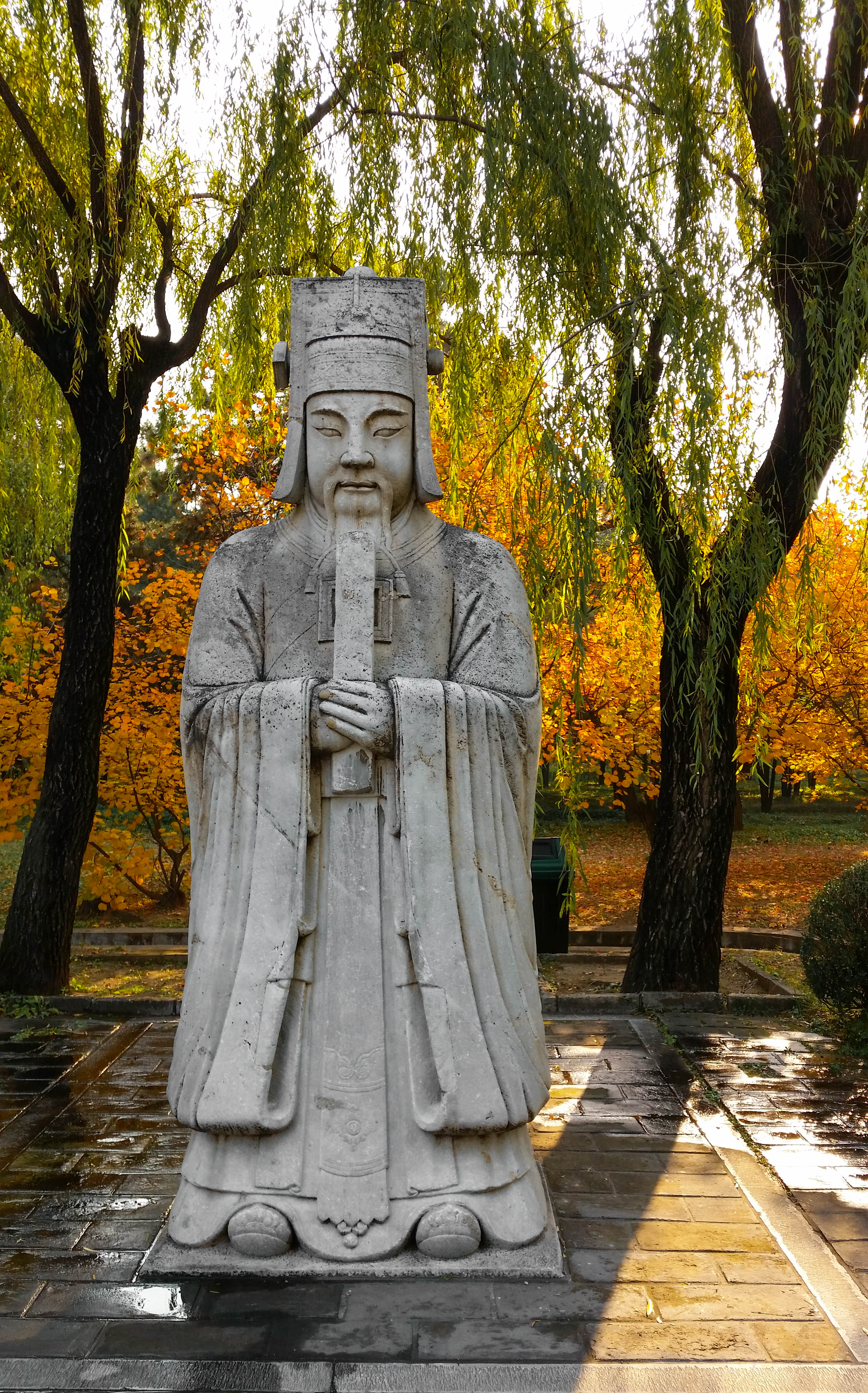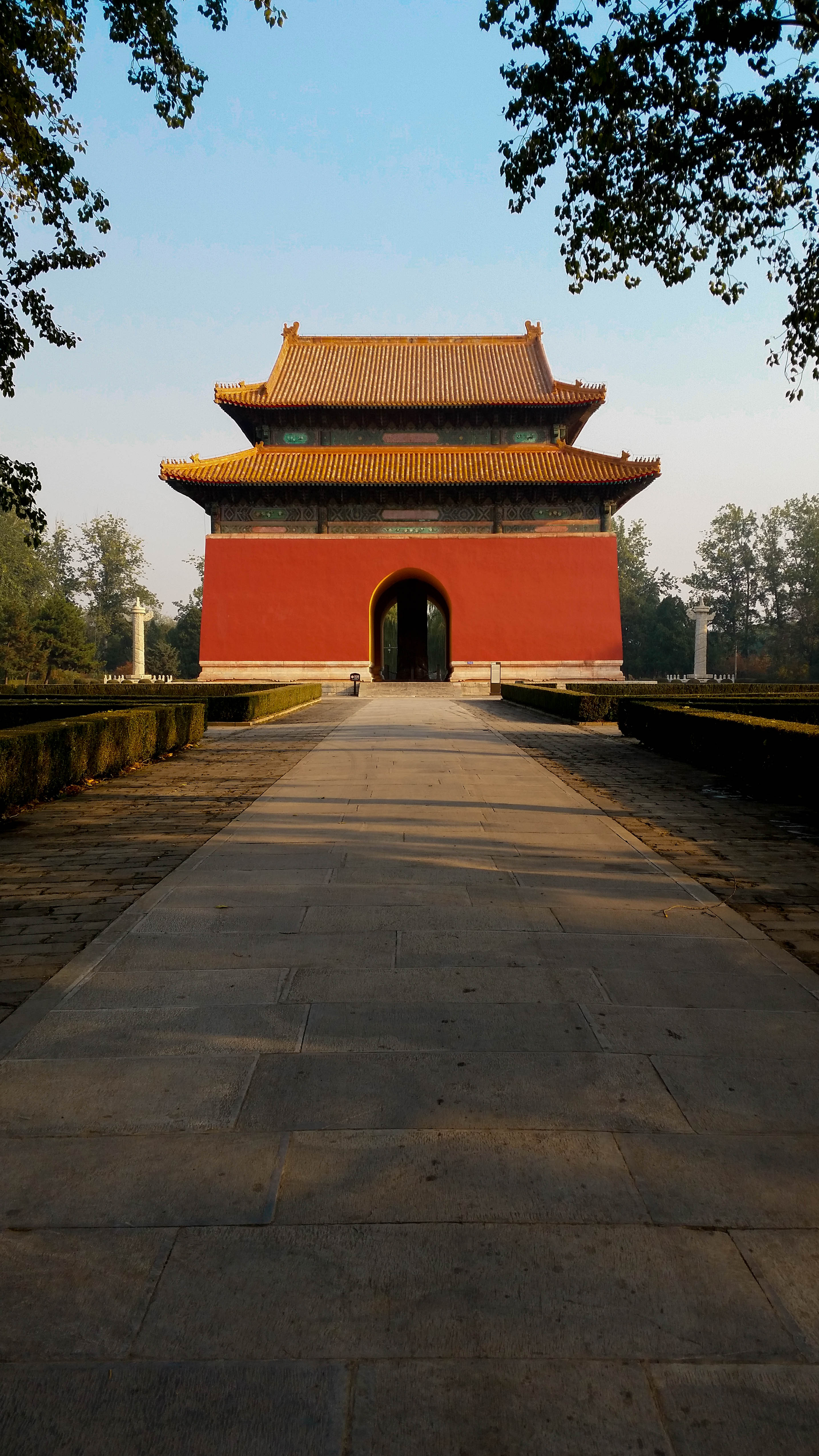 We had a great few days and managed to even leave the city and take a trip to the Great Wall, which was a very early start Tuesday morning. The girls had arranged for a tour bus to pick us up at their hotel at 6:40h in the morning. Yes, you read this correctly, a craaaazy early start. The tour started in a small van. Joined by four other people, our first stop (after 5 minutes) was another hotel where we were told to wait for the “real” tour bus to pick us up. 40 minutes later a young Chinese guy came into the lobby and, in good enough English, asked us to follow him. The tour bus was bigger indeed but still not comparable to any bus in Europe that I’ve seen lately. Shane said the bus sounded like the bus his school won in blackboard jungle (apparently the Irish among you will get this). But we didn’t care. It was clean, it was warm and the journey could begin. Before we went up north to the Great Wall, we had a quick stop at the Ming Tombs just outside Beijing. I had never heard of them before and I doubt I would have found them on my own to be honest. You definitely need a car to get up there. More interesting than the walk through it, was the fact that we must have been the first visitor’s group of the day. The place was completely empty and we were rewarded with lovely pictures of the early morning sun shining through the colourful trees.