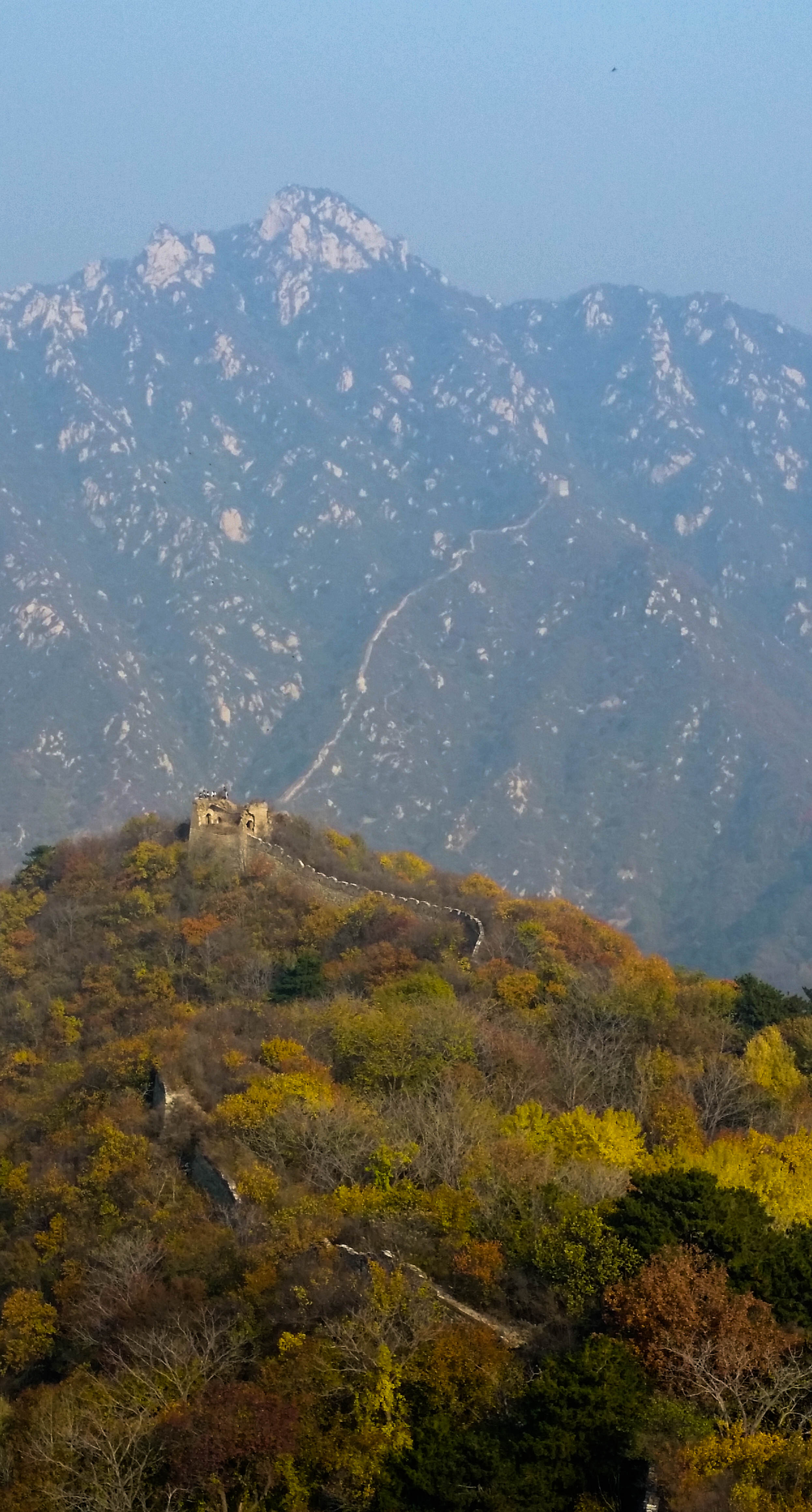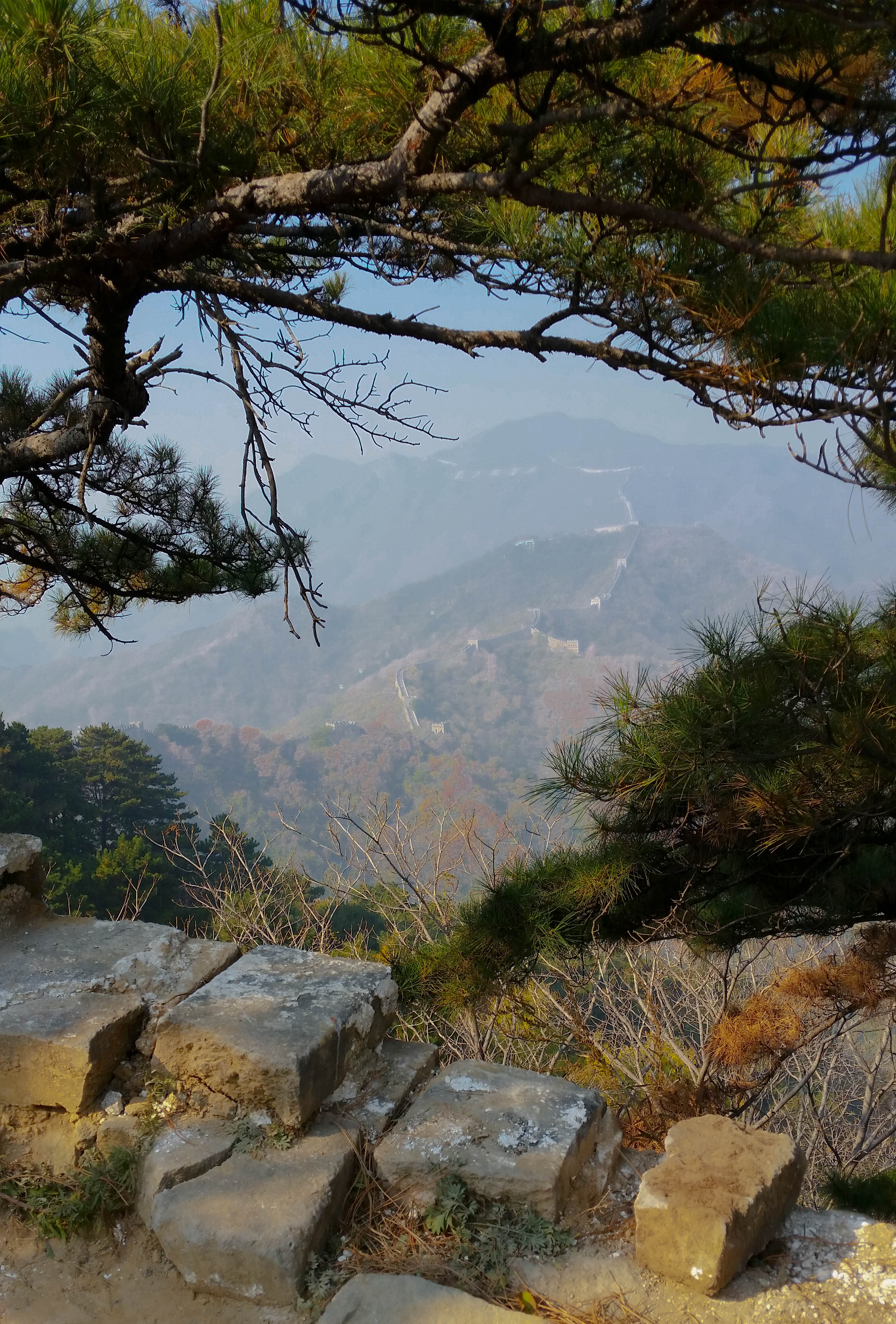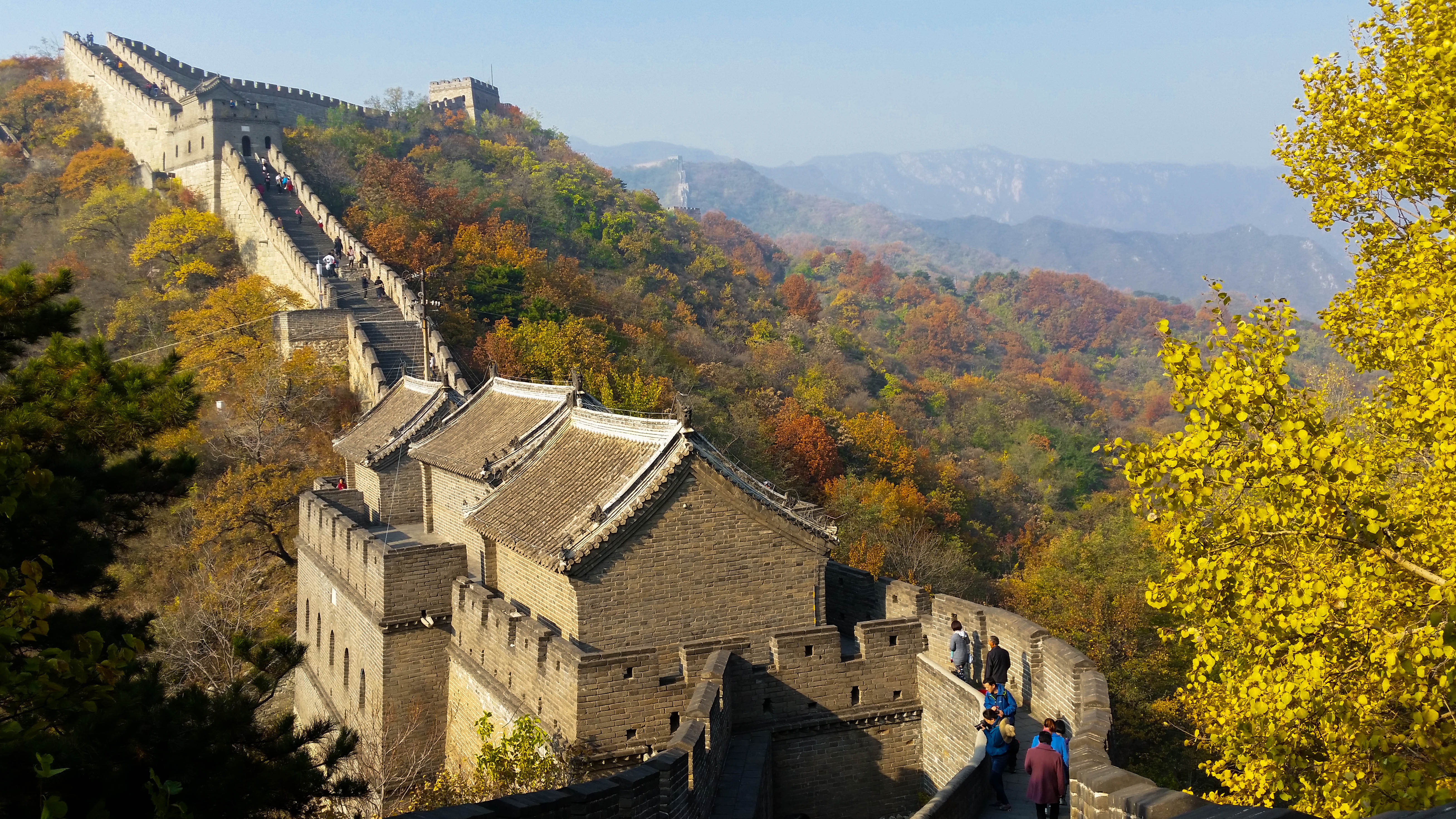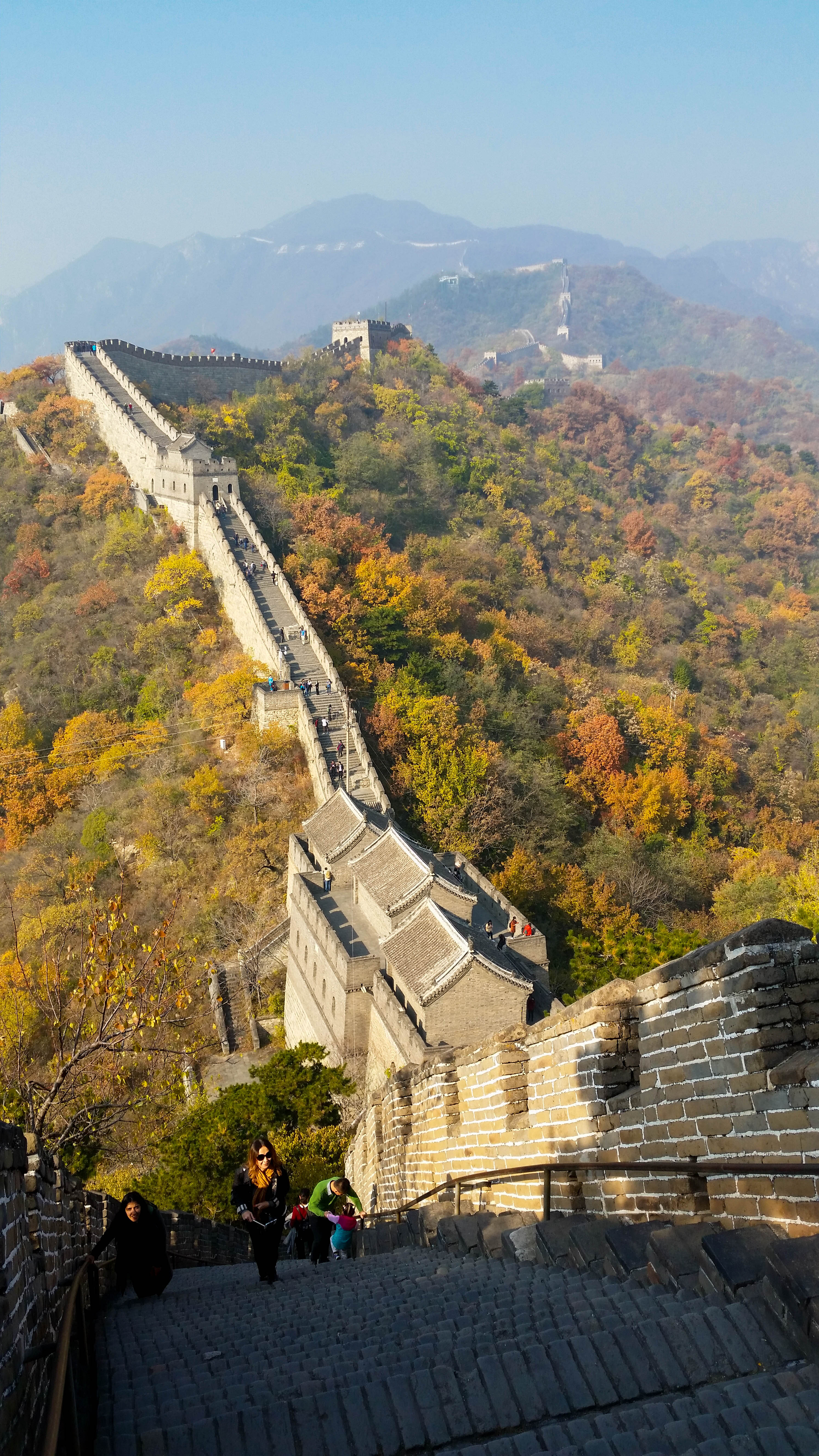 It took us another hour and a half by bus from there to reach the Great Wall section of Mutianyu. Apparently the best place for entering the Wall. Less crowded by tourists and a more scenic view than the usual tourist spots was the promise of friends of mine and they were right! (Even though I don’t know what other sections of the Wall are like yet). We had two hours there on the Wall to ourselves, so we didn’t waste any time and instead of walking 400 steps up to the Wall, we went for the easier way and took a ski lift up the hill. Not something for people with a fear of heights though. Even I thought it was pretty high (and I’m not afraid of anything usually) and hoping the Chinese construction will hold. It did. And if we thought the view from the lift was spectacular, boy were we in for a treat. I cannot describe how beautiful it was up there on the Wall, seeing this massive construction made of stone surrounded by trees right as they were changing into their spectacular autumn colours. A pure treat for the eye despite the smog narrowing the depths of ours views.