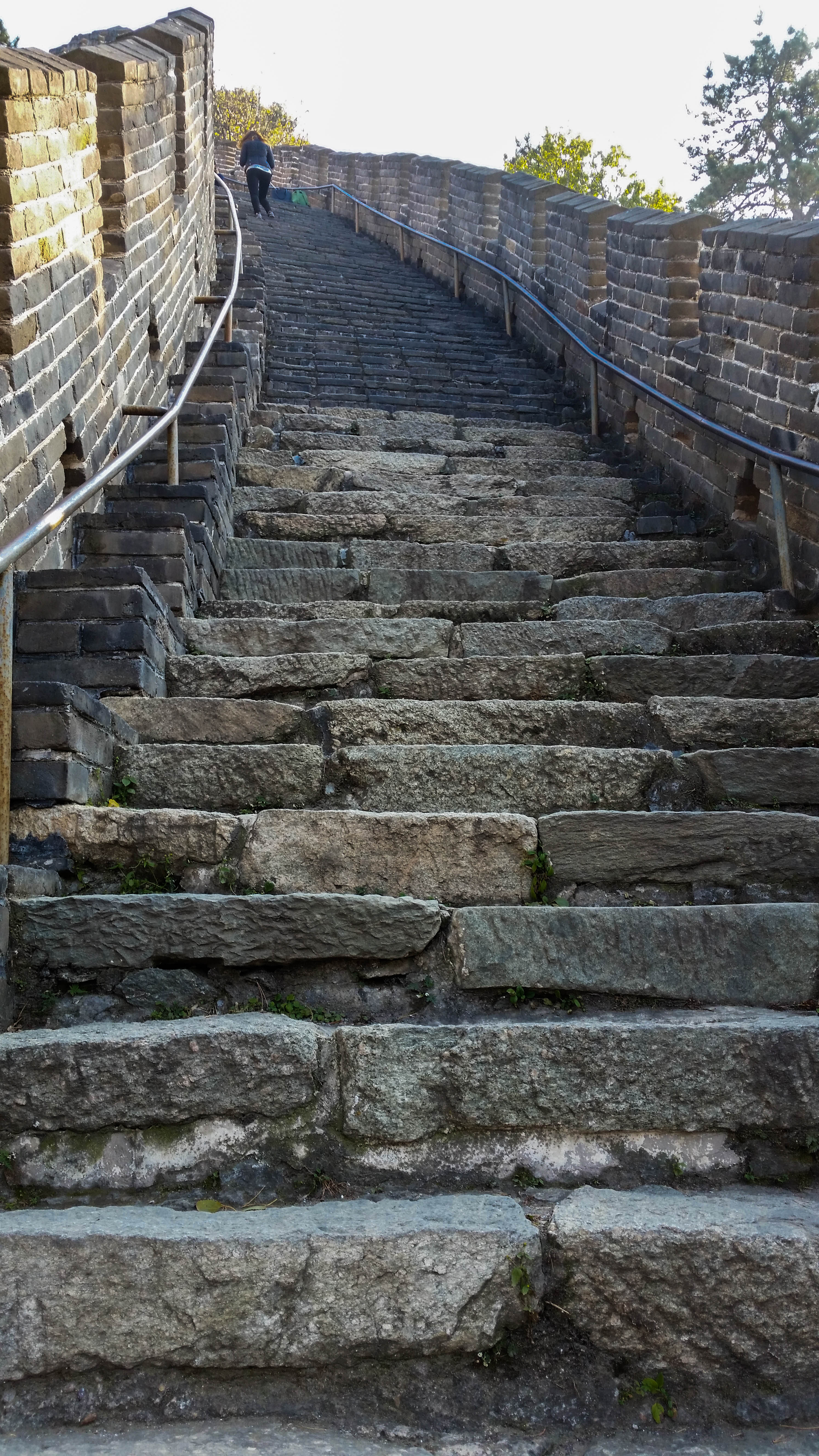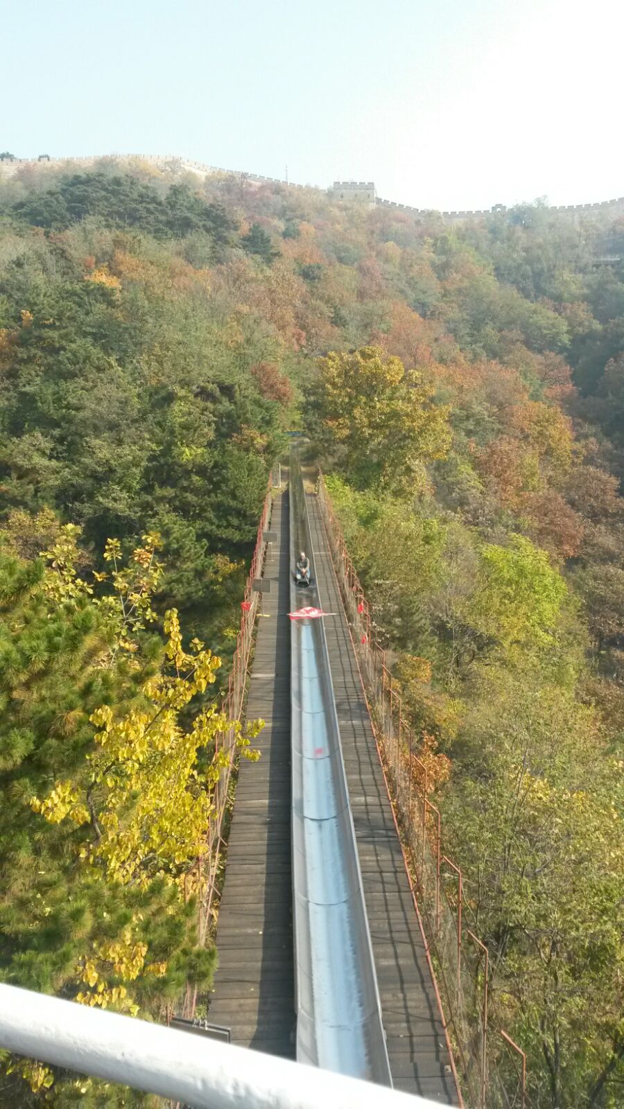 Von dort brauchten wir nochmals zirka 30 Minuten mit dem Bus bevor wir endlich vor der Chinesischen Mauer standen. Naja, eher dem Eingang des Touristenabschnitts. Mutianyu ist nur ein Abschnitt entlang der Mauer der für Touristen zugänglich gemacht wurde. Zum Glück und Dank der Empfehlung meiner Freunde aus Peking der wohl ruhigste Abschnitt. Und sie hatten Recht. Kaum Touristen und nicht überlaufen. Wir hatten zwei Stunden auf der Mauer, es hieß also keine Zeit zu verlieren. Deswegen haben wir uns dagegen entschieden die 400 Stufen hochzuklettern um auf der Mauer zu stehen und wählten die etwas leichtere Variante. Den Sessellift. Nichts zur schwache Nerven, selbst mir war ein wenig mulmig zumute auf dem ratternden Ding aber wohl eher wegen der chinesischen Bauweise statt der Höhe. Das Ding ist eben nicht „made in Germany“. Der Lift hielt aber natürlich und hat uns einen unbeschreiblichen Ausblick geschenkt. Trotz Smog. Es ist schwer zu beschreiben wie schön die Mauer an einem sonnigen Tag ist. Diese Konstruktion aus Stein welche sich tausende Kilometer durch die Langschaf zieht, umgeben von einem herbstlichen Farbenspiel der Bäume. Ein wahrer Genuss fürs Auge. Auf der Mauer ging es dann auf und ab. Ich kann Euch versichern es sieht ziemlich leicht aus im Fernsehen ist aber bedeutend anstrengender als ich dachte. Ich bin eigentlich ne ganz fitte Person aber nach ner Stunde auf der Mauer bin auch ich ziemlich außer Atem gewesen. Bevor wir dann wieder Richtung Bus zurück mussten gönnten wir uns einen letzten Blick über die Weite der chinesischen Landschaft und entschieden dass es zu früh war um das Abenteuer zu beenden. Wir nahmen also nicht den Sessellift um wieder von der Mauer runterzukommen. Wir entschieden uns für die schnellere und weitaus spaßigere Option: die Rodelbahn!! Warscheinlich noch unsicherer als der Lift aber definitiv ein weiteres Highlight unseres Trips.